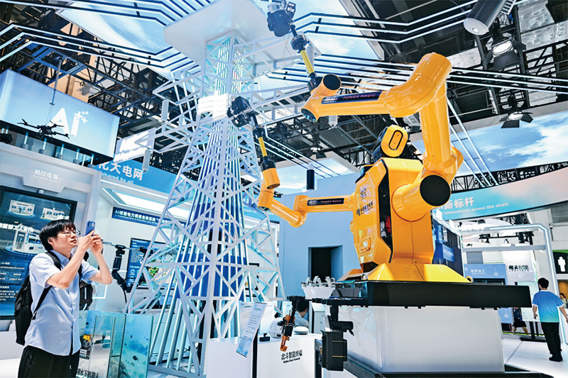 7月26日至28日,2025世界人工智能大会暨人工智能全球治理高级别会议在上海举办。“智能时代 同球共济”的主题贯穿始终,为全球人工智能领域带来一场思想与创新碰撞的盛宴。图为参观者在中国南方电网展区拍摄“悟空”带电作业机器人。新华社记者 陈浩明/摄