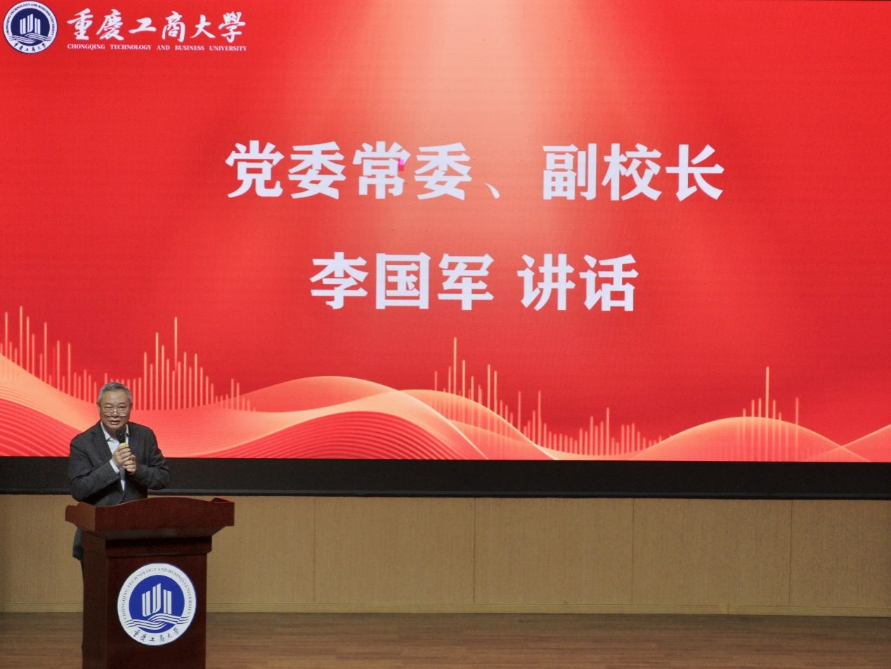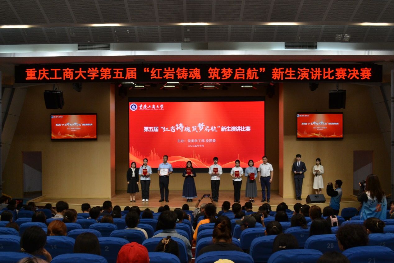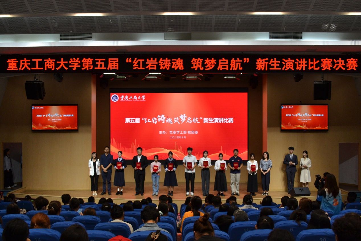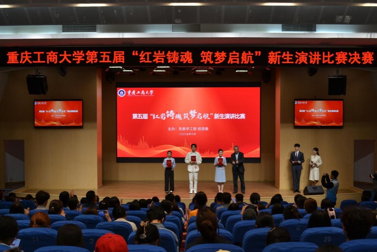 李国军作总结讲话。他首先对本次比赛的成功举办表示热烈祝贺,向精心筹备比赛的指导老师与工作人员表示感谢。他指出“红岩铸魂·筑梦启航”系列活动是我校坚持多年开展的团学品牌,在2025年入选了重庆市教委“红岩思政”精品项目。在学校第五届“红岩铸魂·筑梦启航”新生演讲比赛决赛现场,同学们以真挚的情感、深刻的思考和流畅的表达,讲述成长故事、展望职业未来,体现了新时代青年的责任担当,赢得了师生的广泛共鸣与热烈掌声。本次活动经过班级初赛、学院复赛的层层选拔,最终18名选手脱颖而出站上校级决赛舞台,这不仅为同学们提供了展示自我、交流思想的平台,更是大一新生认识自我、融入大学的一次重要尝试,助力他们在集体中互相学习、共同成长。他希望新同学以此次演讲为起点,树立远大目标,转变学习方式,发扬“勤学善思、求真笃行”的学风,增强自主学习与集体协作能力;坚持全面发展,夯实专业基础,注重实践锻炼,塑造强健体魄与积极心态。他勉励全体新生在重庆工商大学这片充满希望的土地上脚踏实地、砥砺奋进,努力成长为有理想、敢担当、能吃苦、肯奋斗的新时代好青年,在中国式现代化建设的伟大实践中书写无愧于时代的青春篇章。