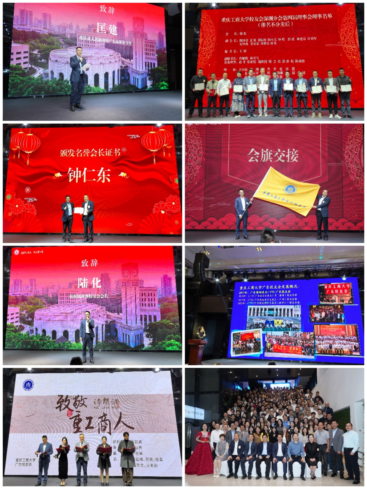 典礼上,田双全为广东校友会第四届理事会会长、副会长颁发聘书,为上届会长、1990级机械制造工艺及设备专业钟仁东校友颁发名誉会长证书。钟仁东校友与继任会长、1995级法学专业陆化校友进行会旗交接。陆化校友作为新任会长登台致谢发言。活动中,校友代表朗诵了由学校校友会副会长、广东校友会创会会长、1989级机械制造及其自动化专业敬廷武校友原创的诗歌“致敬重工商大人”,真挚的文字、质朴的感情,承载着广东校友对母校的眷恋、对老师的感谢、对同窗的牵挂,引发了全场校友嘉宾的强烈共鸣,将庆典现场的氛围推向高潮。